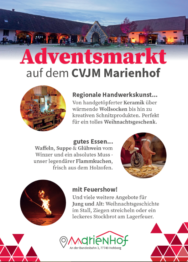 Der Marienhof ist in buntes Licht getaucht. Nach einem leckeren Flammkuchen schlendert man mit einer dampfenden Glühweintasse über den Kunsthandwerk und deckt sich mit schönen, handgefertigten Weihnachtsgeschenken ein. Ein Lagerfeuer wärmt kalte Hände und die Kinder lauschen entweder der Weihnachtsgeschichte im Stall oder streicheln unsere Tiere im Kleintiergehege. Eine kleine Bühne bietet Möglichkeiten für spontane Musik- oder Textbeiträge. Highlight ist ganz klar die Feuershow!
